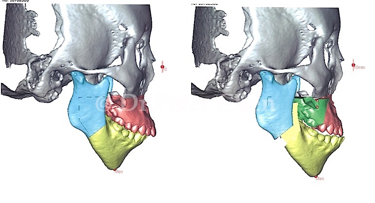約半年前有個類似的例子,病患是在北京念書的小女生,本來只是因為下巴後縮想做下巴手術改善,檢查後發現合併有呼吸道狹窄及咬合不正( class II occlusion ) 等問題,利用正顎合併術後矯正改善,前幾天放暑假回來複診,一方面臉型改善,下巴出來了,一方面睡眠品質也變好了。